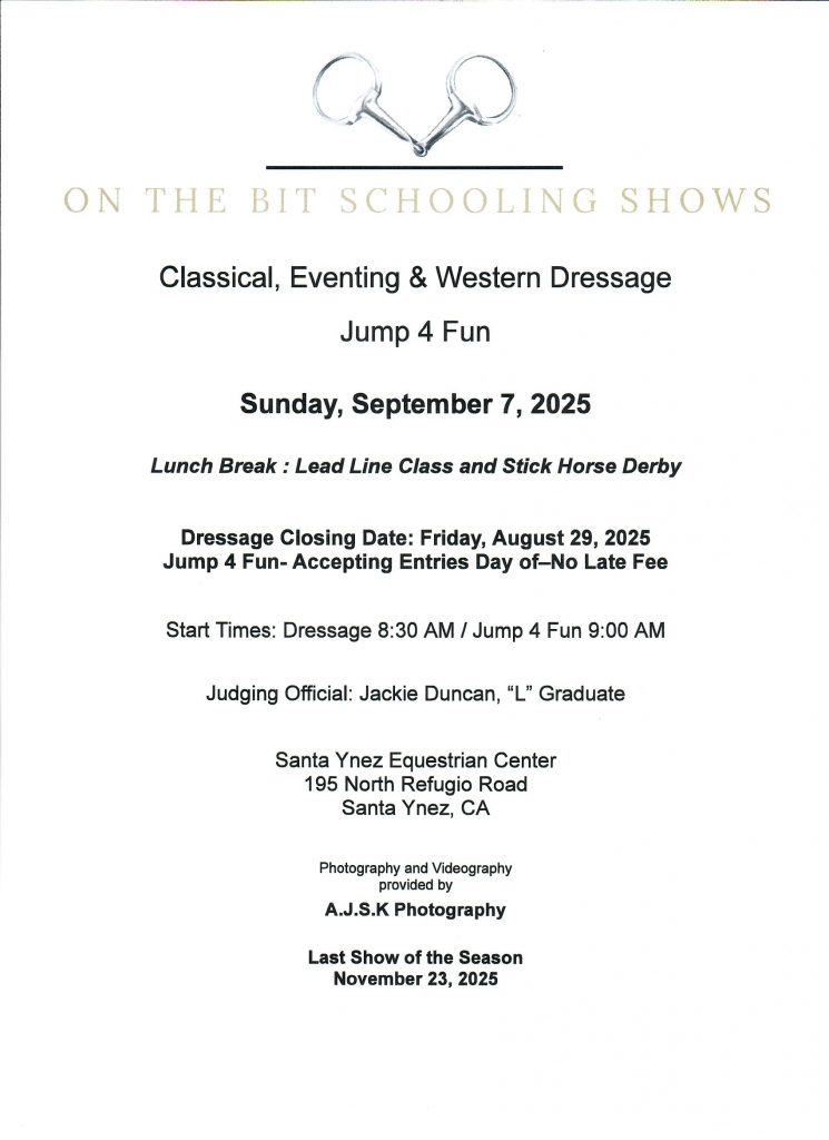 We are excited for our 2025 Dressage Schooling Show and Jump 4 Fun Series! The show dates for the 2025 year are , September 7 and November 23. We will offer Year End High Points for those who enter a minimum of 3 out of 4 of the shows, in addition to our daily High Point awards.