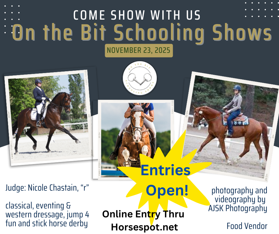 Go to https://horsespot.net/ and select Add Entry under the On the Bit Schooling Show. You will be guided through the process of setting up a horse, rider, owner, and trainer. This will take a few steps, but the system is very user friendly and once you have your information in the system it will be saved. Another new feature with the online entry is credit card processing. With every entry, HorseSpot will require the entry of a credit card. Your credit card WILL NOT BE CHARGED at time of entry. You will have the option to pay at the show by check or cash, should you choose. Once the show is completed and we close out the show, all entries that have not received day of show payment, credit cards will be charged. There has been a huge demand for credit cards so this system will simplify the process. We understand there may be a bit of a learning curve, and we appreciate your patience as we all get familiarized with the system.